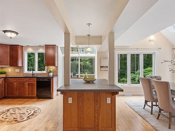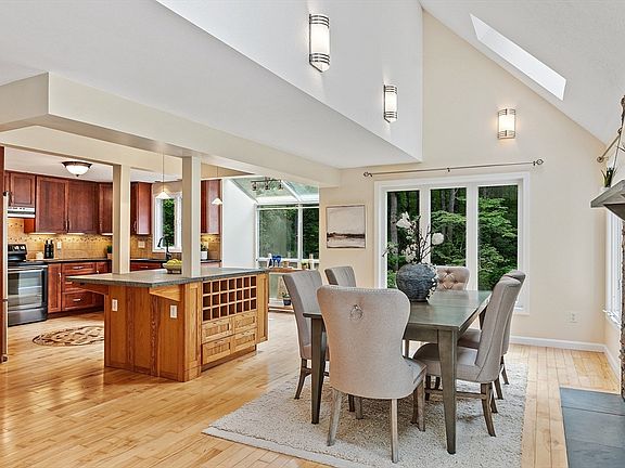 It’s down a mossy driveway illuminated by dappled light that flickers through trees; a quiet kind of magic that greets you as you return home. Here, utter privacy unfolds - a house nestled amidst towering pines, verdant landscaping and no one else in sight. This 1982 contemporary is defined by its living/dining spaces- south-facing with double slider doors, vaulted ceilings with skylights, perfectly radiant. It opens out to a vast deck made for alfresco meals between the unbroken green and open skies. A handsome kitchen with warm wood cabinetry and a small solarium beckons cozy gatherings. 2 primary bedrooms, one on each level, both with walk-in closets. An airy loft between the upstairs rooms offer space to entertain, or gather as a family room. Below, a full walk-out basement is ready to be finished to your desire. Outside, a silent in-ground pool whispers of future swims and starlit evenings. For the first time in over 8 years, you'll get a chance to live in this very special abode.
