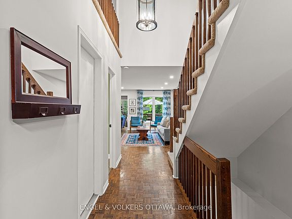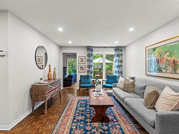 Ideally situated on a quiet street in sought-after Hunt Club Woods, 12 Hackett Street offers privacy, natural beauty, and urban convenience. Nestled alongside and backing onto Hunt Club Creek, this meticulously maintained four-bedroom home provides serene views, access to wooded walking trails, and a low-maintenance, professionally landscaped yard, all just minutes from the Hunt Club Golf Course and Mooney's Bay. The bright foyer with mirrored closet doors opens to warm parquet flooring and a dramatic two-storey hallway. The living room features expansive windows, recessed lighting, and an open flow to the dining area, where an iron chandelier complements treetop views. The updated kitchen is equipped with granite counters, full-height maple cabinetry, modern hardware, and a raised breakfast bar, connecting to the family room with a stacked stone gas fireplace and direct access to the rear deck. Upstairs, the primary suite offers a spacious walk-in closet and a luxurious ensuite with a soaker tub, dual-sink vanity, and glass shower. Three additional bedrooms - one with a charming bay window, providing versatility for family or office space, all served by a refreshed full bathroom with a quartz vanity and black-and-white mosaic tile flooring. The fully finished walkout lower level seamlessly extends the home's living space with wide-plank hardwood floors, a sleek wet bar, a cozy gas fireplace framed by a charcoal feature wall, and a large recreation area ideal for gatherings or a media room. A two-piece bath, storage area, and a well-appointed laundry room complete this level. Enjoy direct access to the backyard, where a stamped concrete patio surrounded by mature trees and vibrant perennial gardens create a peaceful retreat. Offering exceptional indoor-outdoor flow and a coveted natural backdrop, this home presents a truly unique lifestyle opportunity in one of Ottawa's most connected and welcoming neighbourhoods.