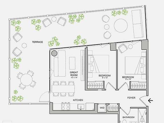 Residence 14 is a rare two-bedroom home offering both thoughtful interior design and exceptional private outdoor space. The open living and dining area connects seamlessly to the kitchen, creating an inviting flow that extends out to a large private terrace, perfect for entertaining, relaxing, or enjoying the outdoors in total privacy.