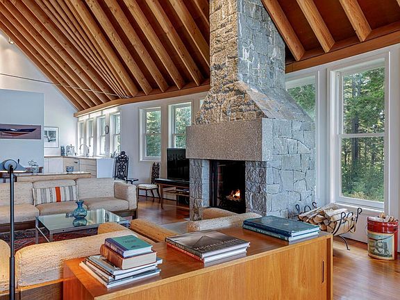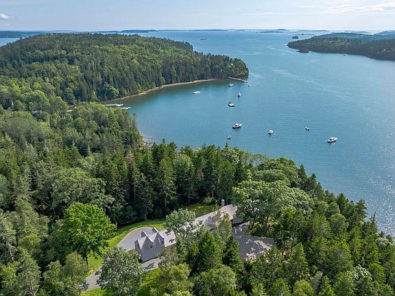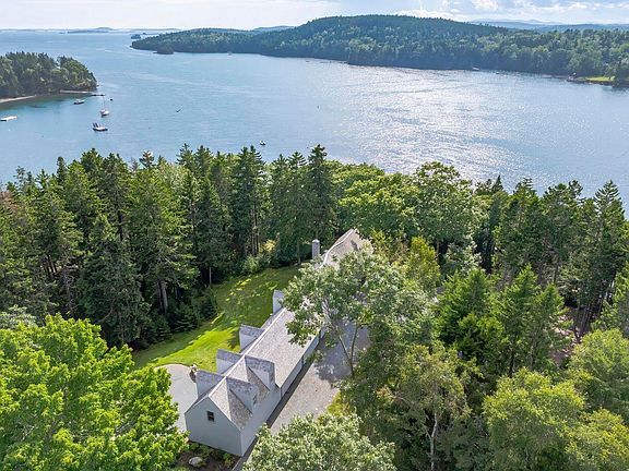 Perched on a steep bluff overlooking Orcutt Harbor with 13± private acres, this Peter Forbes designed residence melds wood and glass into an exquisite work of art. The home was designed to represent a metaphorical bridge extending from the deep woods to the rocky bluff and the ocean beyond. It combines versatile utilitarian features, stunning private realms and artistically elegant living areas in a naturally progressive layout consistent with the architect's vision. Luxurious materials combine with natural elements such as a stunning granite fireplace, and an intricate wood ceiling with curved beams creates a waterlike impression that links the home to its natural surroundings. Impressive open living areas, ideal for entertaining, are highlighted by wood cathedral ceilings in the kitchen, living and great room, and a soaring floor to ceiling wall of glass frames the spectacular view of the forest and Orcutt Harbor. The great room opens to an exterior deck that appears to float over the property and water below. A primary-bedroom suite and a guest bedroom each offer private accommodation with a bath. The property's setting features natural landscaping, and a gently sloping path leads down to 653± feet of shorefront on Orcutt Harbor. There is a deep-water dock with a ramp and float offering access to some of the most scenic and desirable boating and sailing waters on the east coast. The property is subject to a Conservation Easement that protects the natural setting while allowing for the potential construction of a guest cottage or outbuilding. Located within an easy distance to Buck's Harbor, Blue Hill and Stonington, and about a 60-minute drive to Bar Harbor and Acadia National Park.