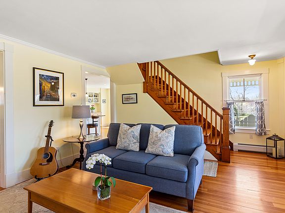 Perched on a quiet side street, in one of Camden's sought after neighborhoods, this meticulously maintained move in ready farmhouse style home is just steps to downtown, harbor, and nearby to endless outdoor recreation options. This home is well suited as a primary residence and/or a second home. On the main level is a light filled eat-in-kitchen, formal dining room, and cozy living room with gas fireplace and built-in book shelves. Additionally, there is a full bathroom, laundry area, generously sized entrance and mud room with direct access to the garage, which has additional flexible use living space above. Upstairs, in the main home, are three bedrooms and a spacious bathroom with shower and separate soaking tub. The basement provides plenty of space for storage. Step outside onto the oversized covered porch, a perfect spot to relax, engage with people passing by, and entertaining. Beautifully landscaped and partially fenced in yard provide a wonderful in town retreat. View our 3D Tour and Floor Plans!