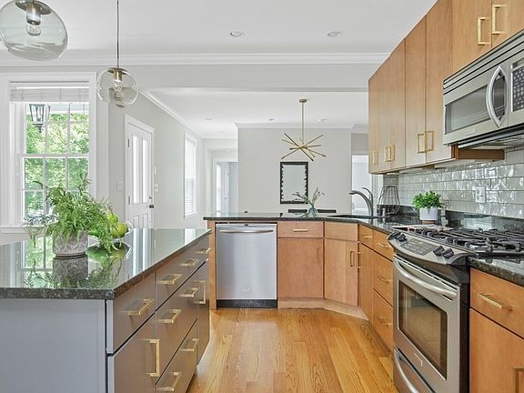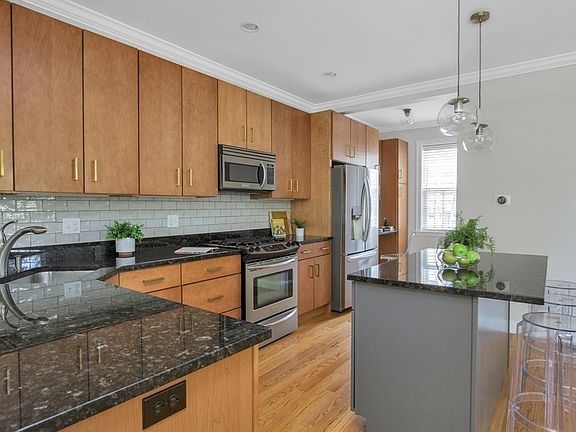 Set in a quiet Somerville neighborhood between Porter and Union Sq, sits the Borden, Bradford, Weld House c.1860 that was completely reimagined in 2009. The quintessence of curb appeal, a wrap-around porch reveals a gorgeous 1st floor condo with high ceilings, oversized windows, and contemporary lighting. Anchored in newly refinished oak hardwood floors, a sun-filled, open floor plan merges the kitchen, dining, and living room in one voluminous expanse perfect for entertaining. Granite counters, stainless appliances, cherry cabinets and extra pantry storage detail a custom kitchen, while lavish marble sets the tone for the adjacent bathroom. A generous primary suite affords a quiet reprieve, boasting vaulted ceilings with no occupants above, plentiful closet space, and a lovely ensuite bath. Equipped with a 2nd bedroom, 2 attached garage spots, and cooling, the unit affords in-unit laundry, ample basement storage, and a hidden backyard haven with lush landscaping and paver patio.