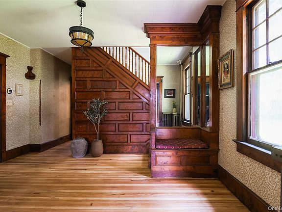Located at the end of a quiet cul-de-sac, this stately Victorian home boasts old-world charm and overlooks the sweet river town of Callicoon. Step inside and discover a treasure trove of delightful details: charming nooks and crannies, a sunny pantry, a built-in bar, and inviting window seats. The current owners have tastefully enhanced the home with numerous improvements, including newly painted interiors, beautifully refinished wood floors throughout, fully renovated bathrooms, and updated light fixtures. Entering, you're greeted by a welcoming foyer, complete with handy hooks and shelves for all your outdoor gear. From there, you're drawn into the center of the home where a two-sided fireplace offers the warmth of a wood-burning fire on one side. The other side houses a pellet stove, efficiently heating both the dining and living rooms, which are painted in a sophisticated, moody blue. The living room is bathed in natural light from large windows overlooking the front porch and features floor-to-ceiling shelving. The dining room, perfect for entertaining, includes a built-in bar area or buffet and provides direct access to the expansive wrap-around porch. Just beyond the dining room, discover the cheerful, updated kitchen. It boasts new butcher block counters, all new appliances, and freshly painted cabinets. A convenient pantry and a half bath are nearby, along with a door leading to the back of the house. Access to the full basement is here as well. The wonderful, covered wrap-around porch is a true highlight. Its spaciousness and fabulous adjustable glass blinds allow you to control the temperature, ensuring comfortable outdoor gatherings year-round. On a side of the house there is a stone patio offering another gathering spot. Five cheerful bedrooms are on the second level, each with its own unique character. One bedroom features a Juliet balcony and a private sink. This level also includes a full bath and an additional half bath. Should you desire an en-suite primary bedroom, a smaller adjacent bedroom presents a logical and convenient spot for adding an additional bathroom. Situated on a double lot, this property offers ample space to add a swimming pool, should you desire. Enjoy leisurely strolls into Callicoon, with its fantastic selection of shops, restaurants, and the classic Callicoon Theater. The scenic Delaware River is also just steps away. All this, conveniently located only 2.5 hours from New York City.