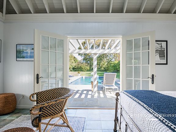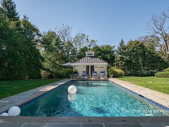 This stunning cedar shingle style home is situated in the heart of Bellport Village, tucked away down a quiet lane within short distance to beach, restaurants and shops. First floor features formal entry foyer, 9 foot ceilings throughout, spacious gourmet eat-in-kitchen with center island and granite counters, six-burner gas Thermador stove & double oven, Subzero refrigerator, wine cooler, and breakfast area. Porcelain tile floor throughout. First floors also includes a den/library with fireplace and French doors leading to outdoor patio overlooking spectacular, mature landscaping, formal dining room, living room w/ fireplace, screened porch off living room. A lovely outdoor area with gas fireplace with views of ample lawn completes the first level. The second level offers 2 en-suite guest bedrooms, office/bedroom, laundry room, main bedroom suite with fireplace, balcony, and spacious bathroom with soaring cathedral ceilings. There is a generous custom walk-in closet adjacent to the main suite. Additional features include expansive full basement partially finished as a gym and 2-car garage. Enjoy the superb backyard and gardens of this 0.75 acre property, complete with gunite, marble dusted pool, bluestone patio, and pool cabana with full bath, CAC and heat.