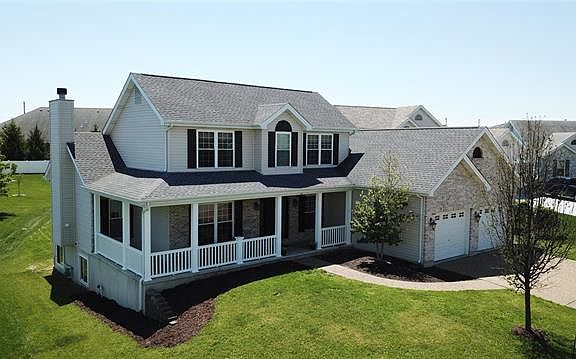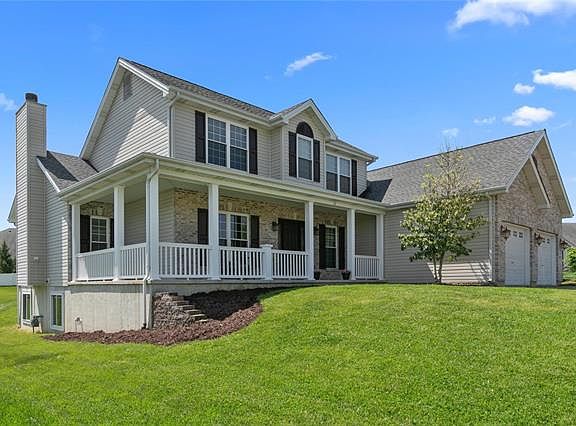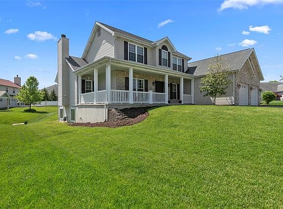 ALL NEW CARPETING! Gorgeous Wentzville 1.5 story home in a cul de sac. Great curb appeal with brick elevation and wrap around porch! Sit out front and enjoy the upcoming weather. Your future home has 4 bdrms, 2.5 bath, oversized 2-car garage with MAIN FLOOR MASTER & MAIN FLOOR LAUNDRY. Most of the home has been freshly painted with neutral/modern color and new flooring! Designated dining room can be an extra office space if needed, wood-burning fireplace, bay windows all along back of home, open eat-in kitchen, MFL gives this 1.5 story home an open concept feeling while enjoying the multi-story benefit of kids/guests bedrooms upstairs. Main floor master has vaulted ceiling, double vanity, soaker tub w/separate shower and walk-in closet! Upstairs are 3 abundant sized bedrooms with a full bath. Bdrm 2 has a walk-in, too! Closet space/cabinet space in NOT an issue with this home! LL is a lookout!