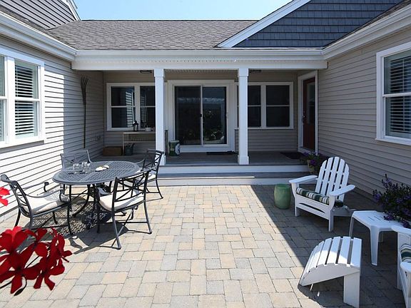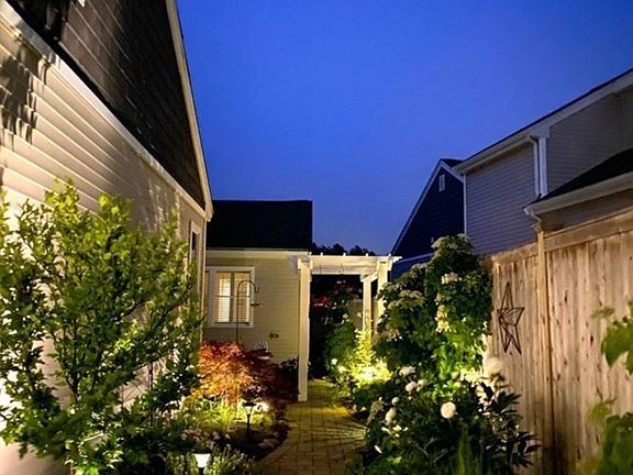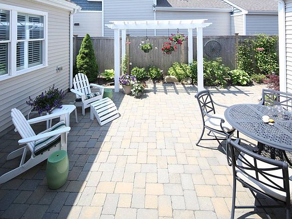 A wonderful location on a quiet tree lined street, walk to Pinehills Village Green. This free standing gated townhouse is a private oasis with its flower filled courtyard and spacious back deck overlooking a wooded ravine. The courtyard is a gardeners delight, mature plants & trees but there is still room for herbs/vegetables. Most enjoyable in the evenings when the solar lights come on. Hardwood floors (natural white oak) on the main level. Open floor plan Fresco 3, granite kitchen counters, white wood maple cabinets with undercabinet lighting, marble mosaic backsplash, GE Cafe series appliances (gas range). Walk-in pantry, laundry/mudroom has built in storage and seat. Recessed lighting, 9 ft. ceilings, plantation shutters. Master suite has view of the courtyard and the green space at the back, tray ceiling, ceiling fan, separate vanities, linen and 2 walk-in closets. Second bedroom has built-in cabinets & bookcase wall. 2nd level has a loft, 3rd bedroom and full bath. Walkout lower.