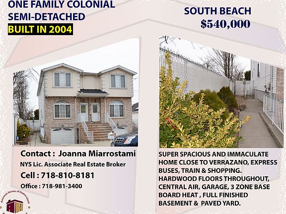 IMMACULATE & SUPER SPACIOUS SEMI BUILT IN 2004, CLOSE TO VERRAZANO, EXPRESS BUSES, TRAIN & SHOPPING. HARDWOOD FLOORS THROUGHOUT, MASTER BEDROOM W/PRIVATE BATH, BUILT IN GARAGE, YARD, 9 FT CEILINGS ON 1ST FLOOR, FULL FINISHED BASEMENT, EXTRA LARGE EAT IN KITCHEN, HAS SLIDERS TO ENCLOSED PORCH WITH DOOR TO YARD. CENTRAL A/C , 3 ZONE. BASEBOARD HEAT. Brokered And Advertised By: American Homes of S I Ltd. Listing Agent: Joanna Miarrostami