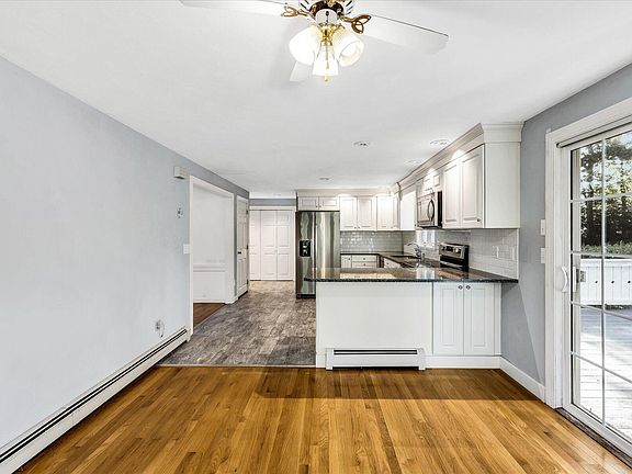 Set back on a lovely wooded lot, this fabulous three bedroom, two bath colonial-style home has been very well taken care of. A convenient side entrance and quaint porch provide access to the oversized two car garage with a heated workshop area and access to storage above. The side door opens to the breezeway with a first floor laundry area and a full updated bath. The renovated kitchen features quartz counters, upgraded cabinets, a breakfast bar and stainless appliances. The kitchen opens to the dining room with beautiful bay windows, wood flooring and slider access to the spacious deck for outdoor enjoyment. The first level open floor plan includes a large living room with a wood burning fireplace, wood floors and a wide stairway leading to the second level. There are three good sized bedrooms upstairs with abundant closet space, and a bright renovated full bath. The primary bedroom has access to unfinished space over the garage for future expansion possibilities. A full basement and picturesque yard with six zone sprinkler system round out this home. There is easy access to major routes and awesome Sandwich beaches and restaurants from this charming neighborhood!