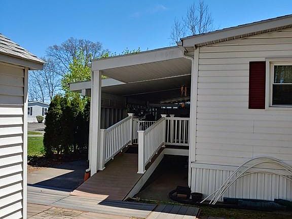 "Age Restricted Community". At least one occupant needs to be 55 or older to comply with Park Rules. This lovely double wide is located on a culdesac in Brush Hill"s 55+ complex. This home has been lovingly cared for and has some wonderful features. There is a trex deck with a pergola that has a canvas cover for the summer season. Enjoy a gorgeous 4 season sunroom, a fully equipped kitchen with high end flooring, double oven and loads of cabinets. There is a movable island and a dining area that is very large with a window seat with storage. There are 3 sun tubes in this home that not only save on energy but make it bright and sunny. Closets galore!! A guest room with fold up murphy bed, beautiful laundry room, ceiling fans in every room. All window tratments remain and a newer on demand gas water heater. There is a carport/garage with opener and 2 sheds. Also available for sale if you prefer.