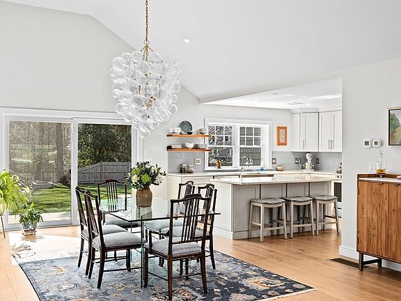 Welcome to 12 Judy Road! This turnkey one-level home has been thoughtfully renovated with no detail overlooked. Enjoy care-free living with low-maintenance materials such as: durable vinyl shingles, composite trim, Ipe decking, and a 30+ year roof. Soaring 14' ceilings in the main living area and abundant windows create a bright, airy atmosphere. The modern kitchen with wine fridge opens seamlessly to the dining and living areas, where nickel board accents define each space. A striking chandelier adds elegance to the dining area, while a stacked stone gas fireplace brings warmth to the living room. The spacious primary suite offers a radiant-heated bathroom and a laundry room with extra storage. Situated on a flat, professionally landscaped lot, the home includes a front patio, a fenced backyard with a deck, and a wooded section with a path leading to nearby school fields and walking trails. Move right in and enjoy all that Scituate has to offer!