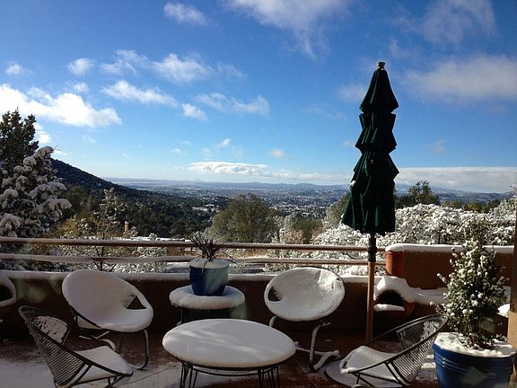 Dos Griegos home combines thoughtful design infused with beauty and the highest standards in local craftsmanship. 3 BD, 2 1/2 bath plus beautiful office/studio. Many high-end features including: elegant ceiling heights, lighting treatments, butcher block & granite counter tops, red oak hardwood flooring, built-in shelving, and hand-crafted cabinetry. Luxurious master suite has an incredible view, and easy hot tub/patio access. Master closet features built-ins and master bath features river stone floor, walk-in shower and Bain Ultra jet tub. Energy-efficient and solidly built with rastra block foundation and SIPS construction. The south-facing layout ensures maximum passive solar gain. Bedrooms & studio feature sliding doors that lead out to relaxing patio spaces. Architect-designed for the beautiful land, property features dramatic views of the high desert, city lights, and the panoramic high and low desert mountain land. Detailed list of custom features available.