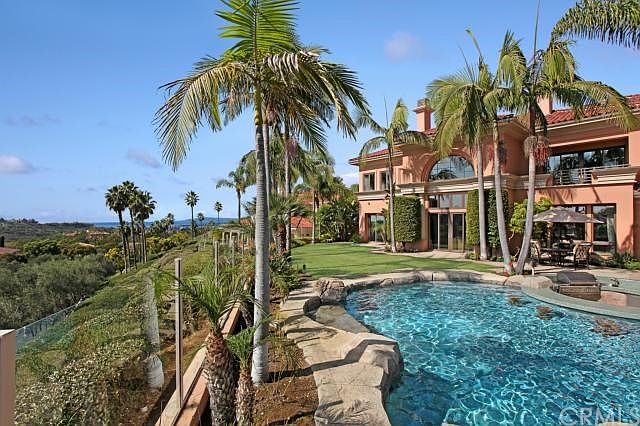 Gorgeous estate perched on an over sized lot in the prestigious guard-gated community of Pelican Ridge. Comprised of 5 bedrooms, 5 1/2 baths in over 6,000 sq. ft. of living space, this home blends wide open entertaining space with luxurious living. Centered around a dramatic formal living room with 25 foot high ceilings, wet bar and a oversized fireplace, this home has a family room open to the gourmet kitchen with a large center island, den, formal dining room and library style office. Fabulous master suite includes a sitting area, covered patio with ocean views, large bathroom with slab Calcutta marble, and walk in closet. Resort style backyard with ocean views, pool, jacuzzi, sunken bar area with swim up bar, fruit orchard, numerous water falls and an ample side yard.