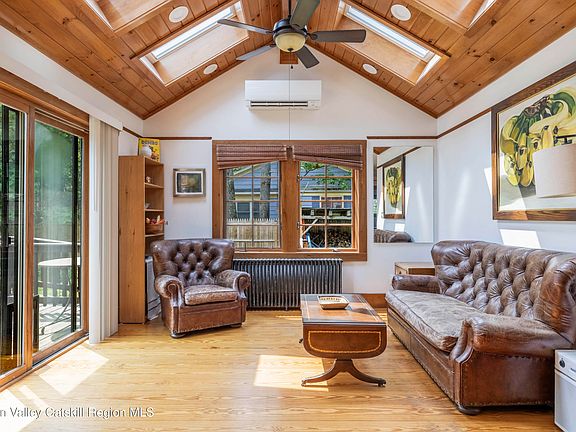 Tucked along tranquil Library Lane, this classic red cottage offers a rare blend of in-town convenience and private, garden-like seclusion. PLUS, there is a legal Woodstock STR permit! Behind the home, a fully fenced backyard - shaded by mature trees and thoughtfully landscaped - frames both the primary residence and detached guest studio with its legal short-term rental permit. This is a true village retreat that feels both peaceful and tucked away despite being steps from the heart of Woodstock. The main house welcomes you with high ceilings and an open living area that flows effortlessly to the outdoors. Large windows overlook the lush yard, and French doors lead to a private deck, perfect for quiet mornings or lively gatherings. The spacious country kitchen is well-suited for everything from casual meals to hosting dinner parties, with a sunny dining area that opens to a bluestone terrace. A library on the first floor offers a flexible space that can serve as a home office or an additional bedroom. Upstairs are two cozy bedrooms and a full bath with a classic clawfoot soaking tub. The primary bedroom features a charming arched nook ideal for reading or meditation. Set at the rear of the property, the detached studio has been updated with a new bathroom, kitchenette, updated windows, skylights, and an airy, high-ceilinged living area. This space is ideal for hosting guests or generating income, supported by the property's legal short-term rental permit, which allows for Airbnb-style use in full compliance with town regulations. Key improvements have been made to the property, including structural enhancements to the basement to ensure the home's integrity and accommodate additional storage space. The property was converted to an on-demand 2-in-1 hot water system for both water and radiator heat. Town water and sewer aid in the easy maintenance of the property. Just moments from the heart of Woodstock, the home is ideally situated for enjoying all the village has to offer, from art openings and live music to gourmet restaurants and eclectic shops. Yet at home, you're surrounded by quiet, with tree-lined back streets perfect for evening walks or friendly chats with neighbors. This is a rare opportunity to enjoy the best of both village life and private retreat - all in one of the most charming corners of Woodstock. A 3D Walkthrough Tour is available in the digital Lookbook or by request from the listing agent.