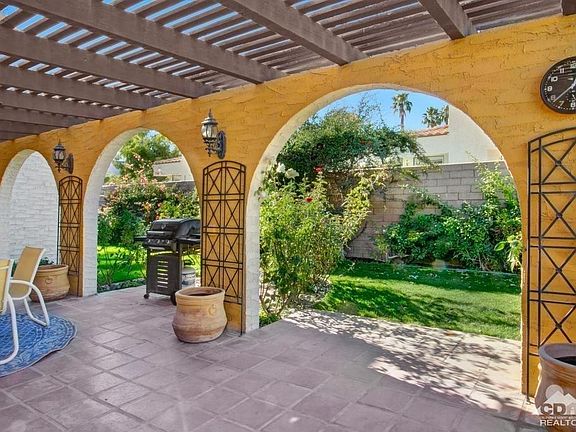 Quiet, private location. Light filled interior with soaring beamed ceilings. The UPDATED KITCHEN is so INVITING and has lots of space for multiple 'Chefs' to prep, cook & entertain with ease as Guests gather around the large center island. This 'HEART OF THE HOME' is cheery and bright and features a large window to view the pool. There are THREE LARGE BEDROOMS and 2.5 remodeled bathrooms. Very private backyard with sparkling pool, spa, lush landscaping and an abundance of fruit trees. Interior upgrades include new ENERGY EFFICIENT A/C condensers, custom window shutters and porcelain tile flooring throughout. Parking and storage includes a TWO car PLUS Golf Cart garage. Presidential Estates is a Gated Community with 52 homes. The LOW HOA $165/month includes a heated community pool, tennis courts + gated RV STORAGE. Convenient location across from Mission Hills CC