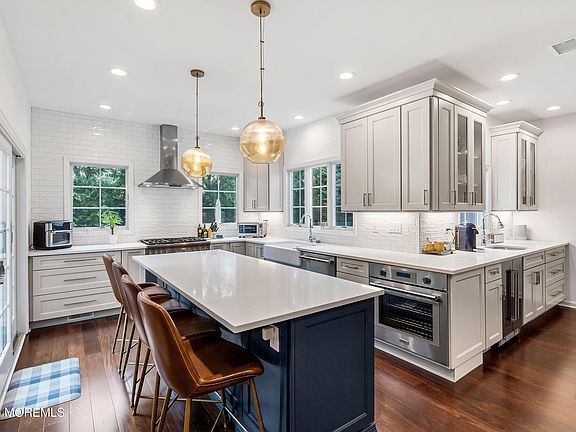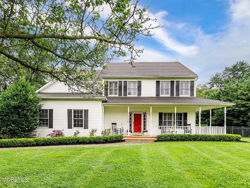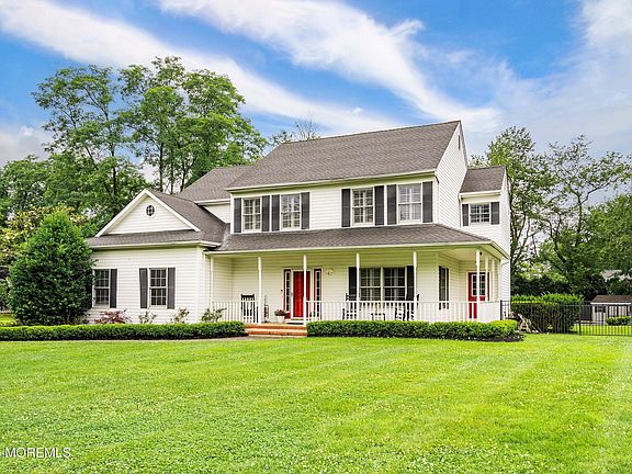 Beautifully sited colonial tucked on a quiet street in Northern Tinton Falls, close to everything! Newly designed and remodeled kitchen features large welcoming island, farmhouse sink, second electric oven, second sink, wine frig. and spacious eat in area. The bright family room offers wood-burning fireplace and a full wall of built-ins. The LR is presently used as the office and the original DR is the joyful playroom off the kitchen. Primary BR and redone bath with soaking tub, shower, heated floors and large walk-in closet. Second floor laundry room. Full partially finished basement. New front walk and landscaping. Enjoy the serene yard with inground pool and soak in nature!