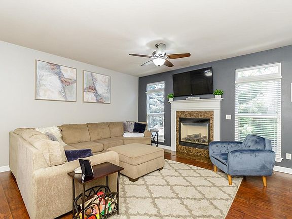 Impressive, 3 BD, 2.5 BA townhome loaded with fantastic finishes! With over 1,800 s/f of beautifully finished living space, you will be wowed by the curb appeal & the smart use of living space. The ext has a brick façade w/stone, low maint vinyl siding, lawn irrig system & a personal mailbox at your driveway. Features inc an open flr plan, wood floors, 9' clngs, gas FP w/marble surround, transom windows, island w/brkfst bar, staggered height cabinets, SS appl, sm top stove-micro-D/W-refrig, lazy susan, bay window in the brkfst room, 2 pnl white doors, convenient 2nd flr Laundry Rm w/wash sink, high effic HVAC, generous sized bdrms, 2 car garage, full bsmt, patio & more. The huge Master Suite will WOW you w/vltd clngs, plant shelf, 2 walk in closets, raised height dbl bowl vanity, vinyl plank tile flooring, skylight & a shower. The unfinished bsmt offers tons of storage & a R/I for an easy future finish. Enjoy a cul de sac lot backing to trees. Easy access to Hwys 364 & 94. It's a WOW!