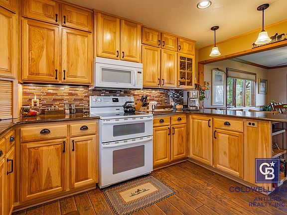 Privacy, Trees, Shop, Horse Property! This home offers the ultimate seclusion among the trees at the end of a dead-end street. A beautifully remodeled interior awaits, featuring quartz counters and a mosaic backsplash in the kitchen with stunning mountain views. The kitchen also boasts Hickory cabinets, a breakfast bar adjoining the dining area. The living room provides serene views of the tree-filled yard and includes a cozy fireplace. Access to the upper covered deck for enjoying a sunset, and morning coffee. The upper level accommodates three bedrooms including a main suite with a private bath, double vanity, bidet, quartz counters, and knotty alder cabinets. A full guest bathroom is also available on the main level. The lower level has been tastefully remodeled, offering a walkout to the lower covered patio, a programmable pellet stove, knotty alder cabinets, built-ins, and crown molding throughout. Additionally, there are two more bedrooms, a 3/4 bath with access to another versatile space suitable for a family room, hobby room, or guest quarters. Walk-out area to a lower partially covered patio! Outside the property features a 2-car oversized detached garage and a newer 40x60 shop with ample space for storage and hobbies. The horse setup includes a barn with loafing sheds and tack rooms, riding arena, round pen, irrigated pasture with gated pipe. In-ground sprinklers. With so much to offer, a viewing is a must for this property. Don't miss out!