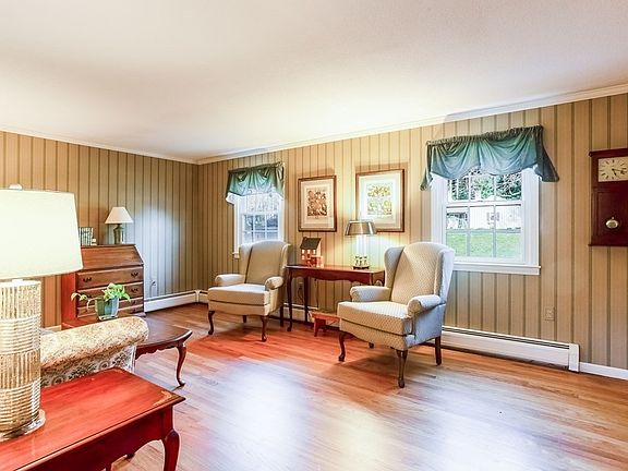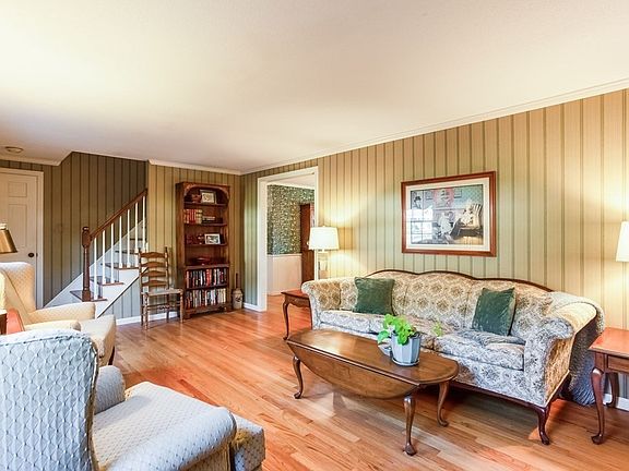 Pristine cape features fantastic location & well-maintained interiors on large lot. Open living/dining room showcases custom millwork, hardwood floors & lots of natural light. Kitchen w/wood cabinetry & tile flooring opens to cozy family room w/vaulted beamed ceiling, custom built-in bookcases flanking wood burning fireplace w/brick accent wall & front side entry leading to breezeway & attached 2 car garage. Adjacent covered porch w/vaulted ceiling provides nice space to enjoy outdoors & private backyard. 2 bedrooms w/oak hardwoods under carpeting & full bath w/linen closet complete 1st floor. 2nd floor has 2 more large bedrooms w/two sets of double closets & oak hardwoods, full bath & large walk-in closet in landing. Lower level offers finished area w/its own heating zone & walk-out unfinished area housing laundry & plenty of storage, New septic to be installed, hot water heater('22), boiler('15), Pella windows throughout('11), roof('11) & vinyl siding('11) add peace of mind & value.