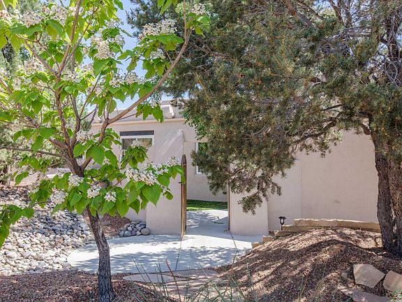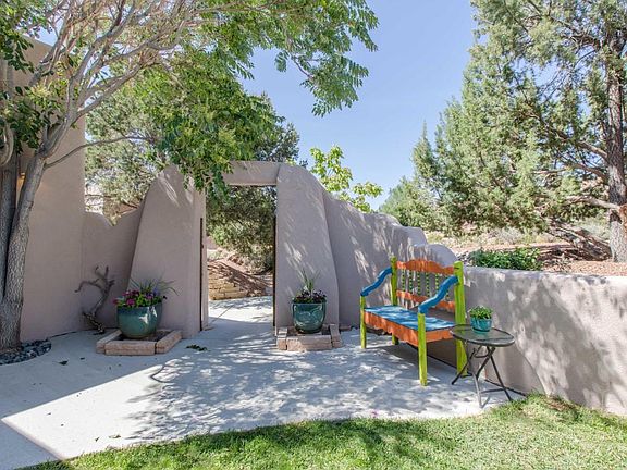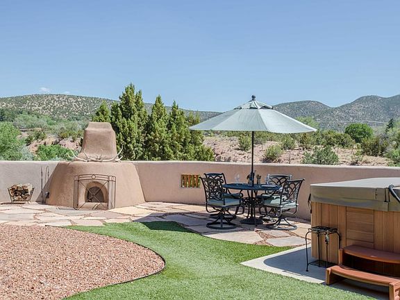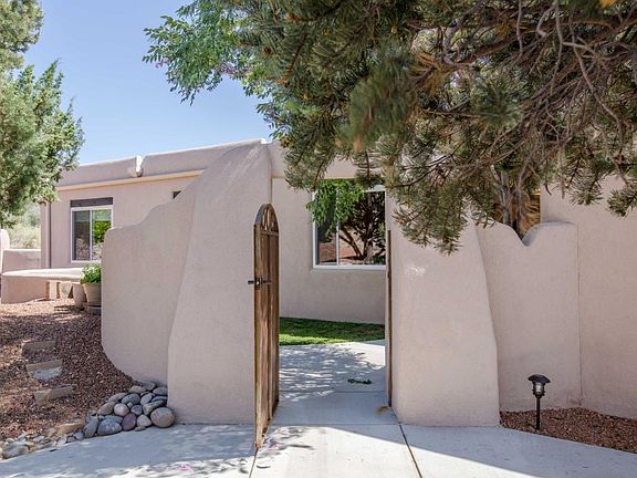 Authentic, charming & meticulously maintained SW style home overlooking the incredible outdoor living spaces with endless views of the vast mesas, cottonwoods from the Arroyo Tierra Blanca below, glorious rolling hills, clear blue skies, fiery sunsets & those majestic Sandia Mountains! Warm, elegant & radiating w/ambiance throughout, from the lush courtyard entry w/custom gates, pristine new stucco, stunning brick & wood floors, adobe accent & plaster walls in the entry, dining, kitchen & living rooms, Kiva fireplace, T&G beamed ceilings, expansive NEW picture windows framing the essence of Placitas...to the spacious bedrooms w/walk-in closets, separate luxurious owners suite w/garden tub, door to backyard w/portal, fire pit, hot tub & 196 sqft detached heated/cooled studio. A Dream Home!