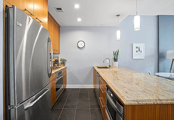 Bright and beautiful 2 bedroom 2 bathroom apartment with private storage unit for rent at The Oakland condominium in prime Greenpoint, where master craftsmanship meets modern allure and design! This luxurious 940 sq ft Brooklyn gem brings your dream vision to life with gorgeous contemporary living space and a large private balcony for enjoying the outdoors. Interiors are bathed in natural light all day long, with huge Pella triple-paned south-facing windows that also minimize outside noise. Your oasis is further enriched by airy 10-foot-high ceilings, newly painted white custom moldings, walls that have been newly painted in Benjamin Moore heron white, and brand new flooring. The generous living and dining room is a perfect backdrop for relaxing and entertaining, connecting to a stylish contemporary kitchen hand-crafted for the chef. Custom wood cabinetry, ceramic tile backsplash and flooring, granite countertops and bar with seating, sink with garbage disposal, and GE stainless steel appliance inspire culinary creations. Step out to the long, wonderful private terrace that is overlooked by both well-proportioned bedrooms. The primary bedroom affords an elegant experience, complementing the custom California closets in both the second bedroom and the entryway, it features a big custom California walk-in closet finished in walnut wood with motion-activated light, gorgeous newly-renovated en-suite spa bath with Kohler fixtures and new tiling in the oversized shower and newly installed custom blackout shade from The Shade Store. The 2nd bedroom is also well-proportioned with ample closets, and the 2nd full bath was also just renovated, richly appointed with a new sink, vanity, and Neptune deep soaking tub. Central air and heat controlled by Nest thermostats in both the master bedroom and the living room as well as a convenient in-home Bosch washer and dryer enhance the living comfort. This desirable elevator building, built in 2009, features 33 units on 6 stories and offers a virtual doorman, exercise room/lounge on the 2nd floor, 2 common terraces on floors 2 and 3, a trash room on each floor, and a package room. The building is pet-friendly and the location is excellent, just a 2-minute walk to McGolrick Park and 5 minutes to the Nassau stop.