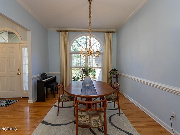 Beautiful golf front home nestled among the longleaf pines overlooking the 2nd green at Talamore. This charming custom-built, single level home has lots of great features and fine finishes that discriminating buyers will appreciate. Gleaming hardwood floors throughout the main living areas, high ceiling, crown molding, chair rail trim with wainscoting, two natural gas fireplaces and lots of natural light. The formal dining room has a 10-foot ceiling set off by an elegant accent column and open to a spacious living room with a soaring cathedral ceiling and tiled corner fireplace. It opens into a bright breakfast nook, kitchen and cozy family room with lots of windows, sliding glass door to a beautiful brick patio, and another fireplace in the family room. The kitchen features beautiful wood cabinetry, granite counters and high backsplash, cooktop and stainless-steel appliances. The primary bedroom in this split plan home is spacious with en-suite bathroom that has wood stain cabinetry, double sink vanity, granite countertop, step-in tile shower and walk-in closet with window. There is a permanent staircase in the garage to access attic storage. The home is surrounded by mature trees and landscaping, providing lots of peace and privacy. Location is conveniently one mile from access to hiking & jogging trails of Reservoir Park by way of Talamore Drive. Talamore Golf Resort membership available.