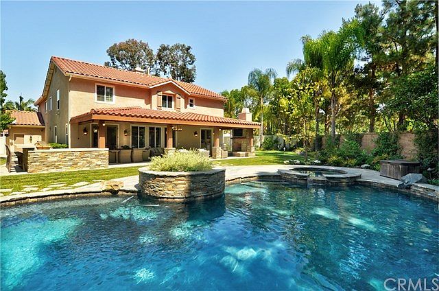 Fabulous unique home for the Irvine area w/huge flat lot offering large pool & spa w/rock waterfall, large grassy areas, putting green, huge covered patio w/Wood accented ceiling, custom chandelier, ceiling fan, TV, Rock fireplace *The built in BBQ has Refrigerator, cook top & spacious eating bar w/room for four chairs*unlike most homes in the area this property is all about the outdoor living spaces & quiet location*Totally private, the grounds include not only the incredible back yard area, but also a large front patio w/even more room for outdoor living*This four bedroom home also has a very large downstairs room built out as an office but easily converted to a downstairs bedroom w/full adjacent bath & doors to the outdoor living area*The modern kitchen w/granite counters & large center island opens to the spacious family room w/a wall of windows overlooking the grounds, built in wine cabinet & built in bookshelves & cabinetry*Kitchen also offers recessed lights, stainless appliances, gas cook top double ovens, separate breakfast area & service area*The master bath is a dream w/gorgeous custom shower, two large customized walk in closets, dual vanities & recessed lights*Not only are there four spacious bedrooms & an office, there's also an upstairs bonus room w/built in shelves & cabinetry Meticulously maintained & perfect for entertaining, additional amenities include a three car garage, tile roof, modern bathrooms, formal living & dining room & custom window coverings