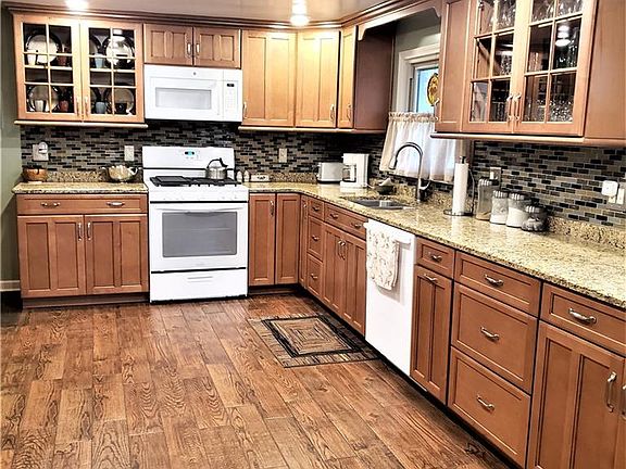 This custom built, 3-bedroom/2.5-bath ranch shows pride in ownership and is located in a quiet neighborhood on a dead-end street. It features remodeled kitchen with soft close drawers, pull out drawers in cupboards, walk-in pantry, granite countertops, glass backsplash, porcelain floor; formal dining room; 16 x 26 living room with white oak hardwood floor; master bedroom with pocket doors, walk-in closet; master bath with ceramic tile walls and floor; second bedroom is 17 x 18 with walk-in closet; 15 x 22 family room; full dry basement with glass block windows, half bath, poured walls, 26 x 34 game room with pine walls, tile floor and wood-burning fireplace; all new Lennox forced air furnace, central air, roof, vinyl siding, casement windows, sliding glass doors in family room, door on attached 2-car garage, seamless gutters, exterior doors; large back deck and park-like yard; 200 amp electric service; double-wide cement driveway with RV pad. Stove, refrigerator, microwave, dishwasher, window treatments stay. This one is move-in ready.