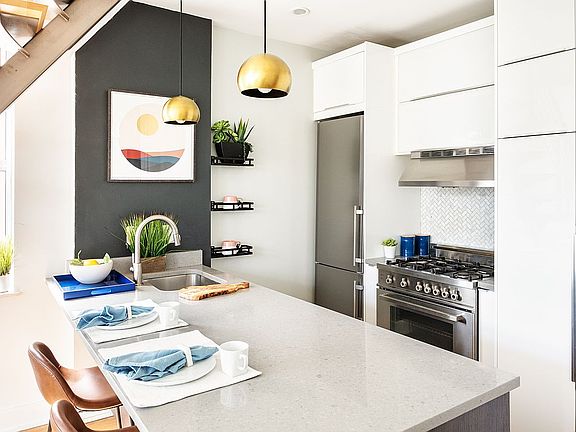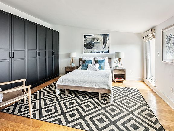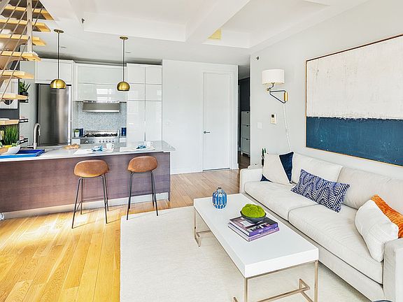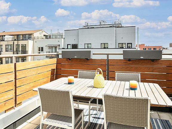 12 Monitor Unit 4B is an Amazing 2 Bed/1 Bath Duplex with 2 PRIVATE Terraces in an Elevator Building in Williamsburg! As you walk into the foyer, you'll find a tailor made shoe storage and a huge a coat closet and Zambrano hardwood floors throughout. Walk a little further and you'll find yourself in the first bedroom. This bedroom has a beautiful oversized window, a large custom built-out closet and can easily fit a queen-sized bed or design it as a home office. The bathroom is just off to the side and is tastefully tiled with different shades of grey and slate and has a deep soaking tub. Walk into the open kitchen living/dining area and you will be stunned by the high ceilings and light pouring in from the French doors and oversized windows. The kitchen has elegant custom-designed Caesar stone counters and white lacquer cabinets and comes equipped with stainless steel appliances (Bertazzoni stove, Liebherr Fridge and DW) and an integrated stacked washer/dryer. The kitchen and living/dining space leads onto the lower private terrace which has ample room for a 6-8 person table to entertain your guests! The second floor is a wonder - it has a massive master bedroom and a second space off the landing that has served as a media room, home office, and a nursery, but is also separated by custom pocket doors. The main bedroom is enormous with custom wall-length closets and room for a king sized bed, and accent furniture! There's another fully built-out double door closet at the top of the stairs, and both rooms lead out to the second private deck. This lovely veranda is perfect for a full-sized couch and two chairs, a coffee table, plants, and 6-8 friends relaxing on a lovely evening. The building is low key with an intercom system in place, super on-site daily, and is situated on a beautiful, classic Brooklyn tree-lined block, quiet and quaint, and walking distance to the L Graham Ave Station, G at Nassau or Lorimer, and McCarren and McGoldrick Parks!