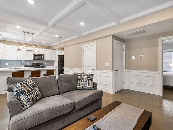 This 2019 renovated home is the middle unit in a classic 3 family in the East Somerville neighborhood. Open plan living room/dining room/ kitchen features hardwood floors, wainscoting and coffered ceiling detail. The kitchen features stainless steel appliances - 5 burner home professional gas range, microwave, refrigerator with water & ice maker, wine fridge, stone counters, tile back splash. The main bedroom is en suite, featuring a shower stall w/ glass door, double sink vanity, and a walk in closet. Second bath is off the kitchen, has a tub, and the stack laundry. Private deck off the front. Good size, 11 x 9, storage room in the basement. Off street parking in the rear. 3 owner occupied units, self managed building. Walk to the Green line East Somerville stop, close to the Sullivan Sq Orange line stop, Union Square.