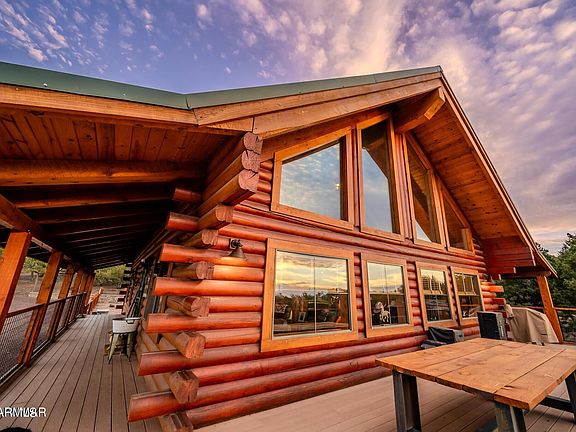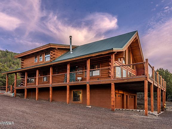 A true White Mountain log cabin that is an equestrian lovers dream. Gorgeous horse property that is set up perfectly for horse boarding! A private gate with keypad is at the entrance and to the right there is a second gate that will allow you into the other acreage. Inside the log home you will be greeted by vaulted ceilings, and large windows for stunning views during every season. The main floor has two bedrooms with gorgeous luxury tile, wood stove, a bathroom with quartz counter tops, and an updated kitchen that features soft close cabinets, and quartz countertops. Upstairs, you have a loft to watch the monsoons roll in and French doors that lead to the grand primary suite. Indulge in the ultimate escape within the embrace of this exquisite primary suite with vaulted ceilings.... heated floors, a large walk in closet with automatic lights, incredible bathroom, and a private deck. Downstairs you have another living area with a custom Murphy bed, bar area, and two separate exits into the garage. Entertainers will LOVE the Cornhole area with score keeping board, cup holders, and pavilion with lights. Plus theres a small miniature cabin for a play house for the kids! There's also a fenced in space immediately off the gorgeous wrap around deck complete with a fire pit. A knock out feature of this property is the MD kick proof/fireproof barn with stunning cobblestone floors, stalls, and private wash room with its own water heater. Also on the property are automatic waterers, a run through with lights, round pens, and a horse washing station. Store your hay in the insulated hay and water tank building that has electric and running water. Also featured is a spray foam insulated shop that is big enough for a small lift, and has heating and cooling. Nope! Not done yet! This home also has another insulated storage building, wood storage area, and the acreage behind the home is fenced off with a mare motel and the perfect spot cleared for an arena! This home has owned solar with its own storage area AND back up batteries for the solar, an enclosed garden, and a private well!! Bring your horses and hit the trails, this home is ready to be yours!!