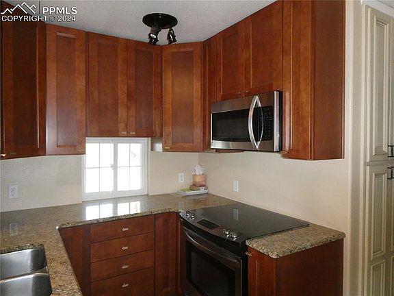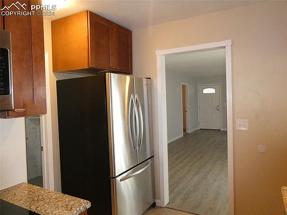 Completely remodeled and move in ready 2 bedroom 1 bath home. This home boasts a completely custom kitchen with new cabinets and granite counter tops, side by side stainless steel sink, double sided refrigerator with freezer draw on the bottom, flat top electric range, wood laminate flooring. Two bedrooms with newer carpet, paint and nice size closets and ceiling fans. Remodeled 3/4 bathroom includes a new vanity, oversized remodeled Manstone shower, laundry hookups, and new vinyl floor sheeting. (Wood decor wall is complements of the Elizabeth high school gym floor!) Large living room has new luxury vinyl planking. Lennox Heat Pump system keeps this over insulated all electric home cool in the summer and warm in the winter with very low cost electric bills. Newer Paint throughout the inside and out. Outside this home has a 20 X 17 attached composite deck with custom railing, lighted ceiling fan, refrigerator, countertop and cabinets and attached carport, a detached drive through 1 car garage/shop and a Huge Metal 26X40 4 car garage/shop with 2 overhead doors and two pass doors with asphalt flooring, ( 20 amp electric is close by, ready to be installed) 2 additional storage sheds attached to the home. All this on a huge, fully fenced, and gated corner lot with plenty of parking for your toys and even has an RV dump. Yard is and landscaped to include Iris, Roses, Peonies, Lilacs and a trumpet vine south of the large covered deck. Other recent improvements include: Double hung vinyl windows, New plumping in 2019, main water line 2024. Roof is scheduled to be replaced before closing. Also note: Partial basement and Verizon Internet. All this is only 28 easy miles from Falcon.
