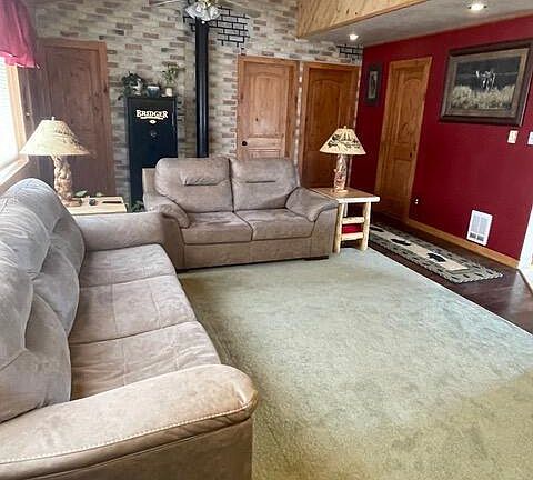 House is move in ready. Home has a lot to offer with 2 nice size extra bedrooms up front and the master in the back. Both extra bedrooms are a great size. Living room has natural gas free standing stove, bookcase on the far end of the room. Kitchen has nice appliances, great storage area on the one wall. To the back of the house you have the dining area with another natural gas stove. Master bedroom and bath with walk in closet to the back of the home. Great deck on the front to enjoy the views and deck on the back to enjoy. Garage/shop is a man's dream. Front of building is the garage and the back is a work shop or man cave. Building is all insulated and heated. Concrete floors. Over hang on both sides. Firepit in the back to enjoy the summer