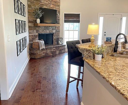 Peaceful setting! This 3bed/2Bath home sits on a beautiful corner lot.(.63acre) Large open concept kitchen/living area. Beautiful kitchen with custom cabinets granite counters and island ,walk-in pantry, stainless steel appliances ( including 1 year old dishwasher) . Living room features floor to ceiling stone fireplace, vaulted ceilings . Large master suite with walk-in closet w crown molding. Master bath includes double vanity, gorgeous tile surround tub huge step in tile shower w/ glass see thru between tub & shower. Great laundry room with built in storage! Additional bedrooms with closets and 10ft ceilings . Beautiful hardwoods throughout and carpet in bedrooms. Covered front porch with huge yard over 200'deep. Attached 22x24 Carport and wood shed at back of the property. Enjoy the full fenced in backyard perfect for kids and pets! (Spray foam insulation for energy efficiency!)
