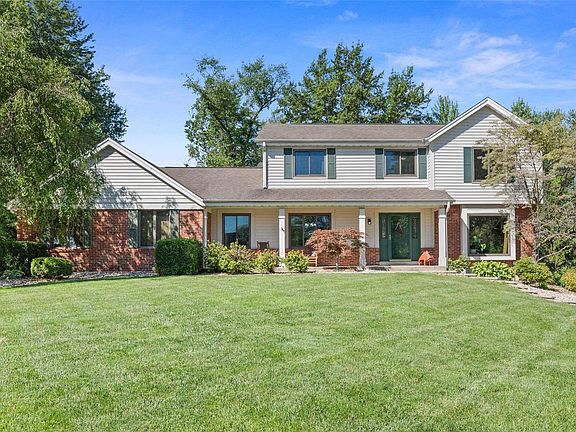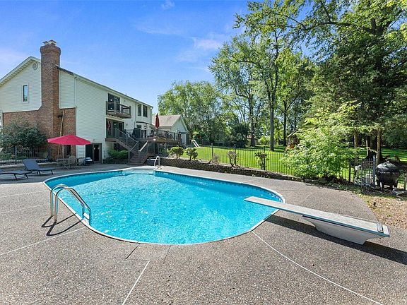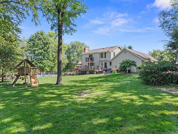Relocation: Stunning two-story home on a serene .81-acre lot in Bogey Hills Estates. Surrounded by lush trees, this property offers privacy plus in-ground saltwater pool & o/s four-car garage. Gourmet kitchen was completely remodeled in 2021 with 42" cabinets, quartz counters, a Wolf gas range, a wine cooler bev center, a coffee station. The main floor boasts a dining room & living room with gleaming wood floors. The family room is a cozy haven with a gas f/p, wood floors, and access to an expansive Trex Deck-2021 that overlooks the incredible fenced yard. The vaulted primary suite offers with an attached bath featuring a jetted tub, sep shower, dual sinks. Three additional spacious bedrooms. The finished walk-out L/L is an entertainer's dream-family room with F/P, wet bar, b/i bookcases, a sleeping area. 4-Car Gar is 41.4 x 21.5. Newer Anderson wood windows. A/C 2019, HWH 2018. MFL with mudroom organizer. This home combines luxury, comfort, and privacy in one exquisite package.