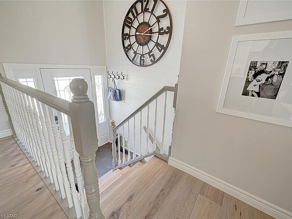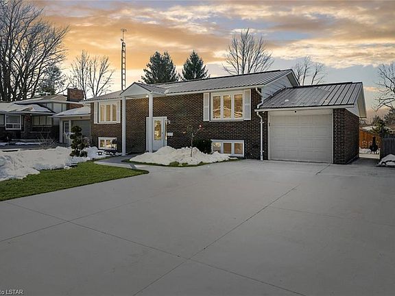Unleash your inner Joanna Gains! This absolutely stunning brick home has had no expense spared. Hexagon tile and wide plank wood flooring carry you up to the main floor living area where your eyes are immediately drawn to the custom kitchen of your dreams. Providing excellent contrast is the navy blue island and dark s/s appliances with gas stove. Set the ambiance with in-floor, under, and upper cabinet accent lighting, while enjoying a glass of wine and your favourite home-cooked meal. Composite decks can be enjoyed from both the main living area and also off the large master suite where you access your private hot tub (negotiable). The main floor is complete with an additional bedroom and bathroom that features a floating wood vanity and stone backsplash. The basement offers a large rec room with a double-sided gas fireplace, surround sound, and an additional bedroom and bathroom. The generous size office (with staircase to the garage) has plenty of room to add a fourth bedroom while still leaving additional space. Other notable features include an additional 20' x 12' (heated & insulated) garage and an 8' x 8' (insulated) shed in the rear of the yard. Notable extras include a backup generator, security camera system, steel roof, 24' x 60' (5" thick) concrete drive, and approx. $3,600/yr in solar income until 2030. Too many features to list! All furniture is negotiable. Save hundreds of thousands of dollars when compared to Strathroy or London! This one won't last long, book your showing today!