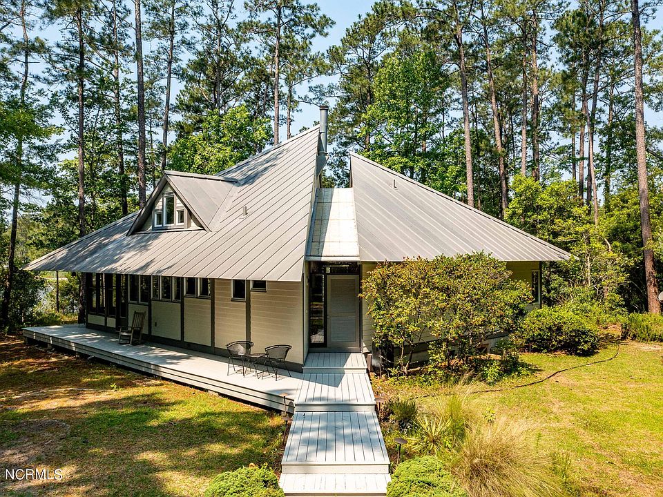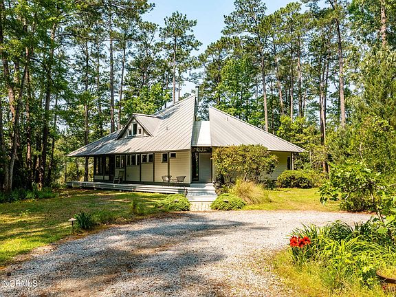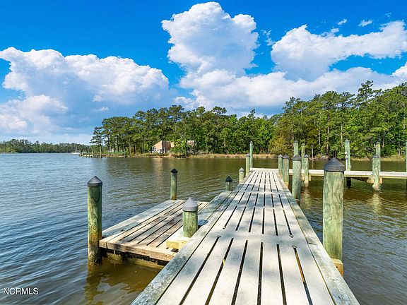 Your dream of coastal Carolina living is here! This custom contemporary home overlooks the confluence of Brites & Orchard Creeks. Fish or crab off your private concrete dock, kayak along the creek, or sail down the Neuse River and Intracoastal Waterway. Nestled among tall pines on 2.1 acres, this tranquil retreat is conveniently close to the charming Village of Oriental, the sailing capital of North Carolina. The meticulously built & lovingly maintained 3BR/3BA main residence features an open living & dining room with vaulted ceilings, skylights, a panoramic window wall, hardwood floors and wood-burning fireplace. Take in the peaceful surroundings from the shady screened porch & wraparound deck. The modern kitchen has stainless appliances & granite counters. A first-floor primary bedroom includes an en-suite bath & walk-in closet. An additional bedroom or office, guest bath & laundry are located on the main floor. A third bed/bath are upstairs where closets and storage abound. Above the detached, oversized (28x28), climate-controlled workshop/garage, you'll find a spacious 521 sq.ft. bonus living space with full bath - perfect for an art studio, home office or guest suite. Additional carport & garden shed can store your vehicles, boats & equipment. Low-maintenance Hardie Plank siding, Galvalume metal roofing & zoned heat pumps enhance this exceptional property. Make plans to see this one.