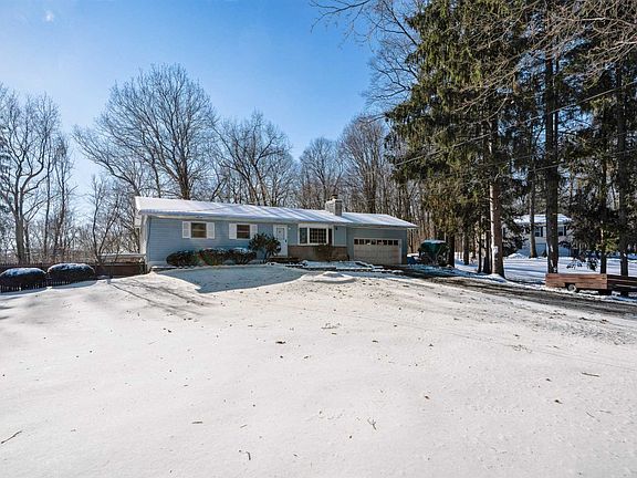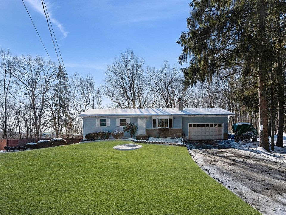 Add your personal touch to this 3 bedroom, 1 bath centrally located home on 2 Acres semi-private property. Enter the cozy LR with brick fireplace and wood flooring. Large EIK with sliders to deck overlooking in-ground pool and walk-in from the oversized garage. Lots of room in the lower level unfinished space just waiting to be finished. You will love the location close to shops, roadways and more.