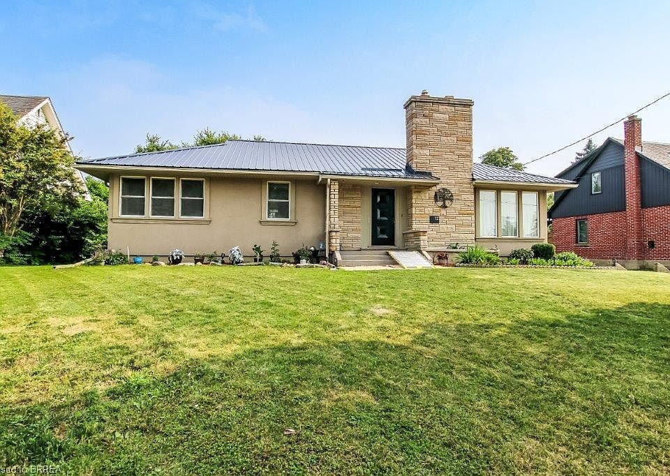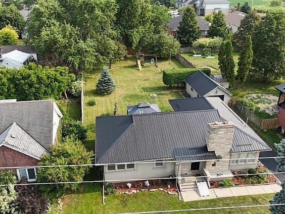 IMMACULATE BUNGALOW ON AN OVERSIZED LOT WITH SUNROOM & DETACHED GARAGE: Welcome to this beautifully maintained 3-bedroom bungalow offering over 1,500 sq. ft. of stylish main-floor living space, located in a highly desirable and mature Hagersville neighbourhood—just 30 minutes to Hamilton, Brantford, and Highway 403. Set on a massive 75' x 200' manicured lot, this property has exceptional curb appeal with its stucco and angel stone exterior (2003), metal roof (2018), and detached 14' x 24' garage. Step inside to find gleaming original hardwood floors, and a warm, inviting layout. The home features a bright, all-seasons family/sunroom addition with wall-to-wall windows and walk-out to the private 18' x 26' concrete patio—perfect for entertaining. The main level is completed with a functional eat-in kitchen with ample cabinetry, a formal dining room which connects seamlessly to a cozy living room with fireplace, three generous bedrooms and a 4-piece bath. The fully sized 1,301 sq. ft. basement includes a 3-piece bath with walk-in tiled shower, a spacious open area with recreation room potential, a dedicated utility/laundry area, cold storage, and an unfinished bonus room which would be ideal for a workshop or home gym. Notable upgrades & features include: - Metal roof on house & garage (2018)- Natural gas furnace (2018) - 100 amp electrical panel (2018) - All windows replaced since (2000) - Aluminum soffits, fascia & eaves and all appliances included. BONUS INCLUSIONS: Gazebo, outdoor dining table, fire pit, and children's play structure. Close to schools, hospital, parks, churches, and downtown shops/restaurants, this immaculate home is ideal for a family seeking a turnkey comfortable home on a large, private lot.