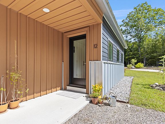 Spacious, modern, solar-powered Saltbox for sale. Built with double wall construction, Marvin windows, and wrapped in rigid foam insulation, the house is designed to produce as much energy as it uses. Post-and-beam hemlock and steel framing and insulated concrete floors compliment the custom birch plywood functional built-ins placed throughout the home. A mid-century inspired slatted maple staircase doubles as a kitchen pantry. Heating and cooling are provided by a Bryant Evolution heat pump with a supplemental on demand propane furnace available for exceptionally cold winter days. A bright entry, kitchen, dining room, half bath, living room, primary bedroom suite and paneled den make up the first floor. Two bedrooms and a full bath on maple hardwood floors upstairs. A separate studio/work out room provides flexibility off the 2-car garage. Set on 1.25 acres and surrounded by several more acres of community owned open space, you can enjoy privacy and bird watching from the home's screened-in porch or one of two stone patios. Fresh vegetables can be grown in a lovely cedar fenced raised bed garden. Whole house back up generator, water filtration/softening system and an EV charger included. Quick back road access to Brunswick and 25 minutes to Portland via 295. Custom built by New Gloucester firm Burnham and Lobozzo, this unique house was the featured cover story of Maine Homes by Down East magazine, Fall 2022.