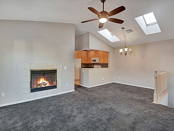 Talk about location! The Hills lifestyle awaits in this two bedroom, second floor end unit in sought after Wood Duck Pond! Home offers direct entry from the one car garage! Enjoy easy access to major commuter routes, convenient shopping, restaurants and community amenities including clubhouse, pool, tennis and plenty of paths to stroll! Adorned with skylights, fan topped windows, high ceilings and balcony! Open concept living space with fireplace, neutral tones and newer carpeting. Convenient kitchen opens to a sky-lit dining area for easy entertaining. Relax in the master bedroom suite with vaulted ceiling. Additional bedroom with peaked ceiling and attractive wall of windows. Ceiling fans, too!