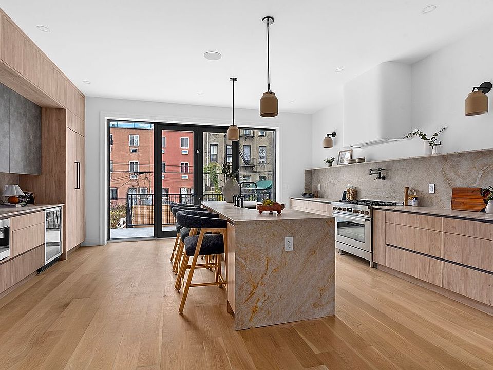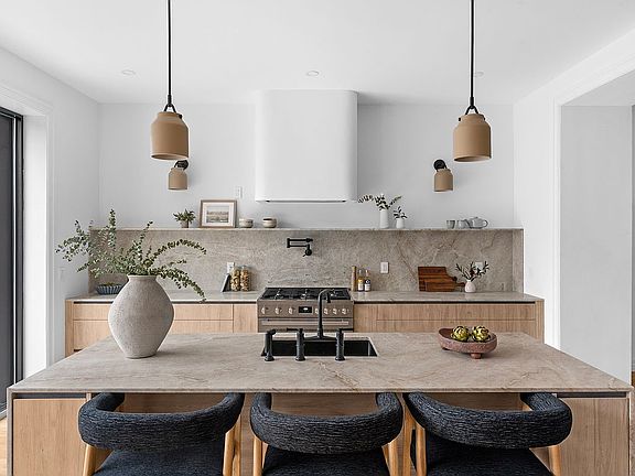 At the heart of the home, a chef-caliber kitchen invites elevated culinary experiences. Anchored by a dramatic Taj Mahal quartzite island and illuminated by sculptural pendant lighting, the space is equipped with a premium Bosch appliance suite, including a 6-burner range, dishwasher, wine refrigerator, and a sleek pot filler. Custom cabinetry and bespoke finishes elevate both functionality and form. Full-height glass doors along the rear façade open onto a 135-square-foot bluestone terrace, offering effortless flow for indoor-outdoor dining and sun-drenched relaxation.