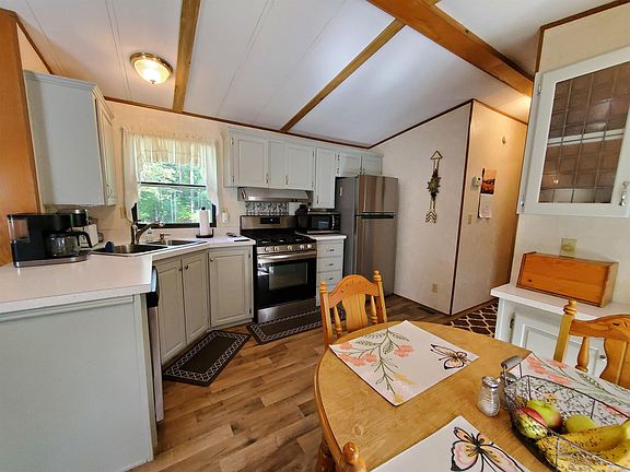 Privately situated in a country setting. This 2 bedroom, 2 bath home is very well maintained with an open living area in the center of the home and the bedrooms on each end. The interior has been refurbished with new appliances, new countertops and sinks in the kitchen and both bathrooms plus all new flooring throughout the home. The vinyl siding and a metal roof make for easy maintenance. This has newer skirting, a slab foundation, a drilled well and a private septic. Enjoy the rear deck to relax on while watching the wildlife or an evening in front of the firepit. The detached 2 car garage is a bonus with a workshop area. Country location with an easy commute.