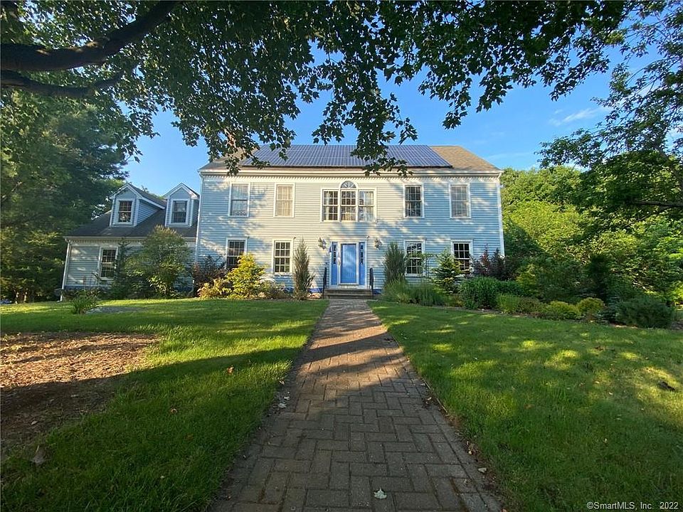 Fabulous energy efficient Garrison Colonial located just minutes from the Guilford Green. Smart technology throughout this home - where do we begin? Solar panels were added in 2019 along with a new propane fired furnace & thermodynamic water heater keep the utilities for an average of $160/M (electric is avg. $20/M and propane is avg. $140/M)This runs your pool heater, central air, heat, hot water & smart technology kitchen appliances. For those who own electric cars, garage is also outfitted with an Nema 14-50 outlet for charging. Newly installed hardwood floors are found throughout this home. State of the art smart Samsung appliances w/ separate induction stove top, wine fridge, wall oven accent the new kitchen cabinets with quartz counters & tiled backsplash. Sliders from the kitchen lead to the large Ipe wood deck & the private level back yard. Newly installed Honeywell thermostats & security complete this energy efficient home. This sun filled classic colonial offers room throughout with a front to back family room with wood burning fireplace & formal living room with access to the dining room just off the kitchen. A half bath and laundry mud room complete the 1st level. The 2nd level offers 4 nice sized bedrooms all with hardwood floors, the primary bedroom with en-suite bath & access to the bonus room. (Also accessible from the 1st level) Capping it off is a custom Gunite heated pool enhanced with a spa. Only 1.3 miles to the historic Guilford Green/Easy I-95 access.