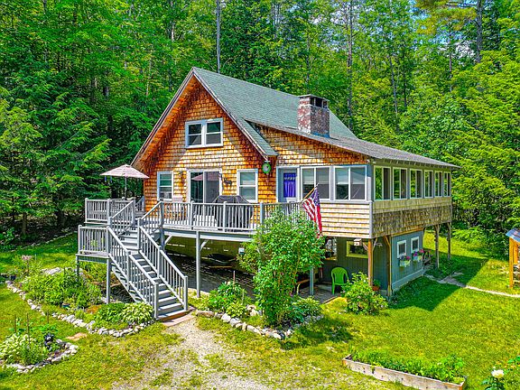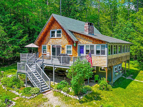 PRICE REDUCED - HIGHLAND LAKE- BRIDGTON- Well cared for 3-4 bdrm, 1 1/2 bath chalet style home with sunny front deck and also large attached screened in porch with 2 car garage on +/-1.67 private beautifully landscaped acres just a short distance from the assoc. beach and docks! Possible to get a boat slip for additional $$. Close to Pleasant Mtn skiing & town for shopping. Cozy open floor plan with wood stove insert in living rm. Full unfinished basement w/1/2 bath. New roof shingles in 2013, garage built in 2019, newer appliances