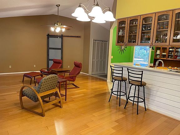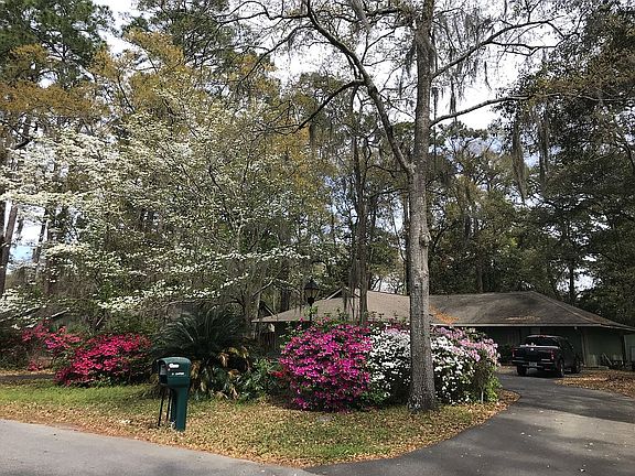 Alljoy area! Rare River Oaks 3 Bed 2 bath ranch, just 1/2 mile from Alljoy Beach & Boat Ramp on the May River! Freshly painted interior w/ spacious open hardwood floors in living/dining area & updated porcelain tile in eat-in kitchen w/11 ft vaulted ceilings. Master has large ensuite bath and private French doors to inviting patio. 2 guest bedrooms just past the barn door. Both baths updated. Open kitchen has a new microwave & touchless faucet has new cabinetry thru out, & a shiplap bar with floating cabs above. Laundry rm adjoins the kitchen and has sink and cabinets, washer & dryer Private fenced yard with hot tub and two sheds. 2 car gar.