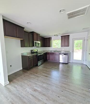 Fantastic end unit townhome in a great location! Open layout! Great natural light! Laminate floor throughout entire downstairs! Large family! Open dining area that leads into the kitchen! Kitchen has great cabinet space with granite countertops & stainless steel appliances! Washer/dryer hookups in the kitchen! Large master bedroom with double closets & private bath! The master bath has a standing shower & window! Good-sized secondary rooms! Home backs to tree line! NO STREET PARKING!