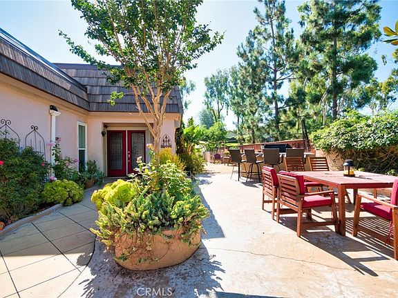 Stepping inside, you'll be captivated by the open floor plan that seamlessly connects the living spaces. The kitchen stands as the heart of the home, showcasing a stunning granite island, a silver Kitchen Aid refrigerator, double oven, Dacor cooktop, Bosch dishwasher, Kohler sink, Vinotemp Wine Cooler, and Panasonic Microwave. A total home water purification unit ensures the highest quality water throughout. Custom cupboards, skylights, and bespoke light fixtures enhance the aesthetic appeal. The living room takes center stage with a dramatic fireplace and hearth, complemented by vaulted ceilings that add a sense of grandeur. Throughout the home, wood laminate floors exude warmth, while the baths feature stone floors and modern finishes. Crown molding adds a touch of sophistication to every room. The layout includes extensive built-ins, perfect for organizational needs, and the third bedroom has been thoughtfully reconfigured as a stunning office space. The romantic master bedroom offers a serene retreat that opens up to the beautiful garden, inviting relaxation and tranquility.
