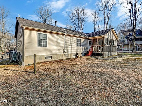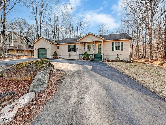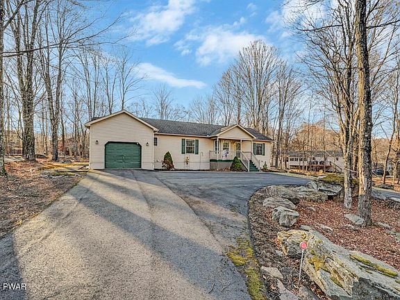 Welcome to this beautifully maintained ranch home located on a quiet cul-de-sac in The Hideout--an amenity-filled, four-season community in the Northern Poconos. Enjoy the convenience of a paved circular driveway, covered front porch, attached garage with ramp for handicap accessibility, and a relaxing screened-in back porch. Inside, you'll find hardwood floors, a cozy propane fireplace, and a desirable split floor plan with the spacious primary suite on one side and two additional bedrooms on the other. The primary suite features a newly tiled walk-in shower. The full unfinished lower level offers plenty of storage or future expansion. Just minutes from the golf course, clubhouse, and indoor recreation center!