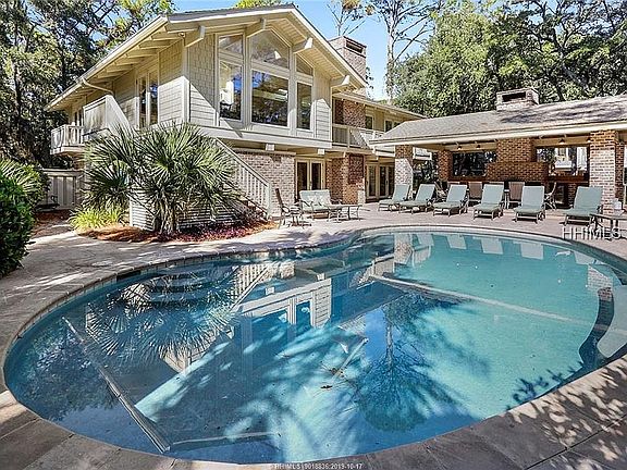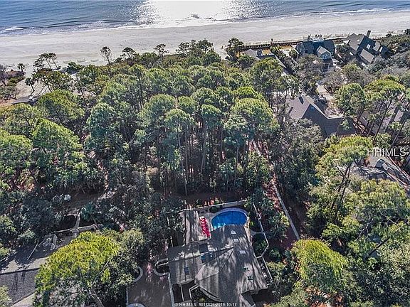 2nd row Ocean masterpiece! 9BR/10BA 7,300 SF home just steps from Sea Pines' most secluded beach. Uniquely situated on oversized lot on one of the island's most prestigious streets. 2 master suites (one w/separate exterior entrance and interior access w/private sitting area). Bright skywalk connects two separate wings, each with 2 full stories. Three gathering rooms, expansive curved staircase, secluded grounds, custom pool, loggia w/brick fireplace & separate outdoor entertaining area. Cathedral tongue & groove ceilings w/enormous exposed rafters, high-finish open kitchen. Rental income $225K+