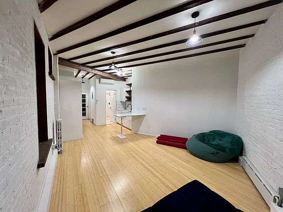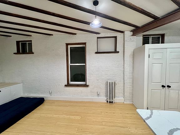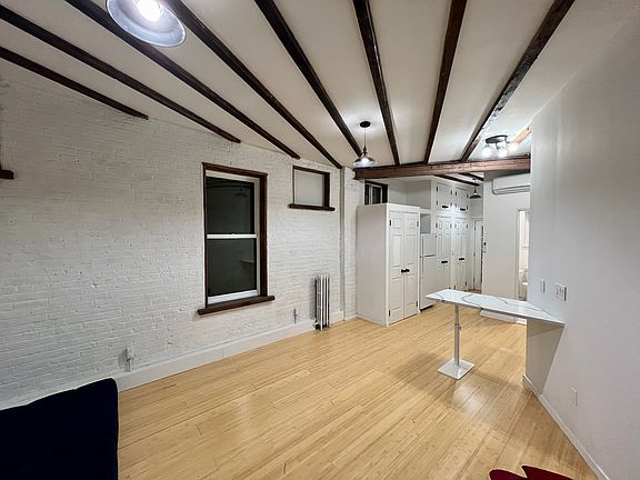Wow this is a very rare little gem! Beautifully renovated and tastefully done all around, this cozy tucked away studio is a little Greenpoint dream! With wonderfully tall exposed beam ceilings, this space has an interesting shape and layout and was built out with the finest materials and fixtures. The glistening bathroom and kitchen feature bright white subway tile and modern porcalin sinks with contrasting black steel fixtures. The kitchen has a wonderful built in marble countertop and bar. The original charm of the old exposed brick walls, window beams and radiators were left intact. There is a ton of closet space in the entrance hallway, there is central air and heat and all utilities are included, a small courtyard and gate lead to this amazingly quiet back house property. Please text for fastest response.